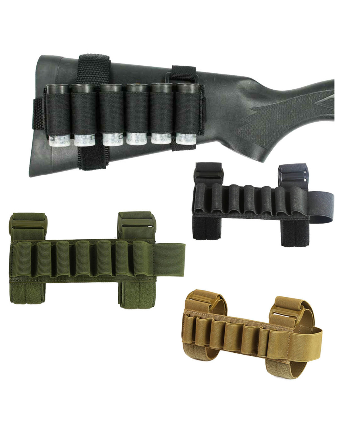 Fastly attaches to the butt and can carry 6 cartridges ( 12GA and 10GA )