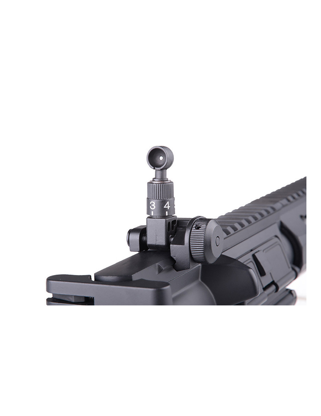 The top RIS rail has equiped with metal folding sights, which can be easily removed to mount a red dot or scope.