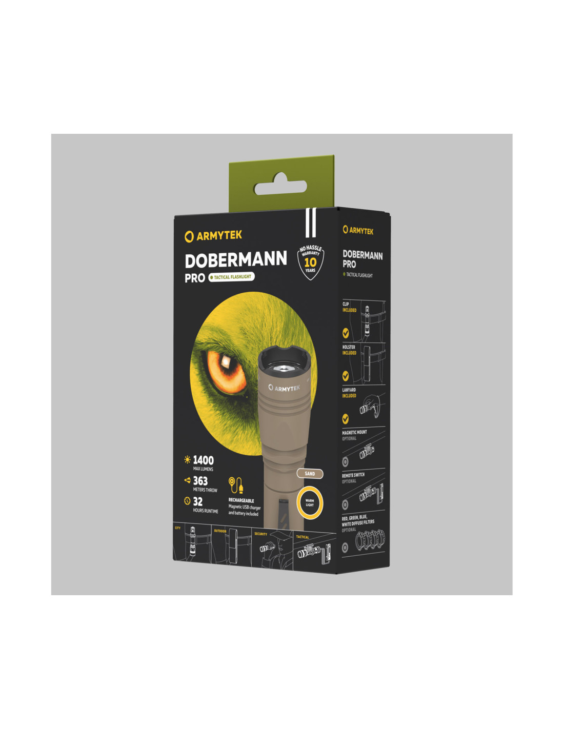 The Dobermann Pro Magnet USB Sand Warm is a 2-in-1 tactical and everyday flashlight offering high performance and outstanding durability. Delivering up to 1400 lumens with a focused beam and smooth spill, it reaches distances up to 363 meters, perfect for medium-range tasks.