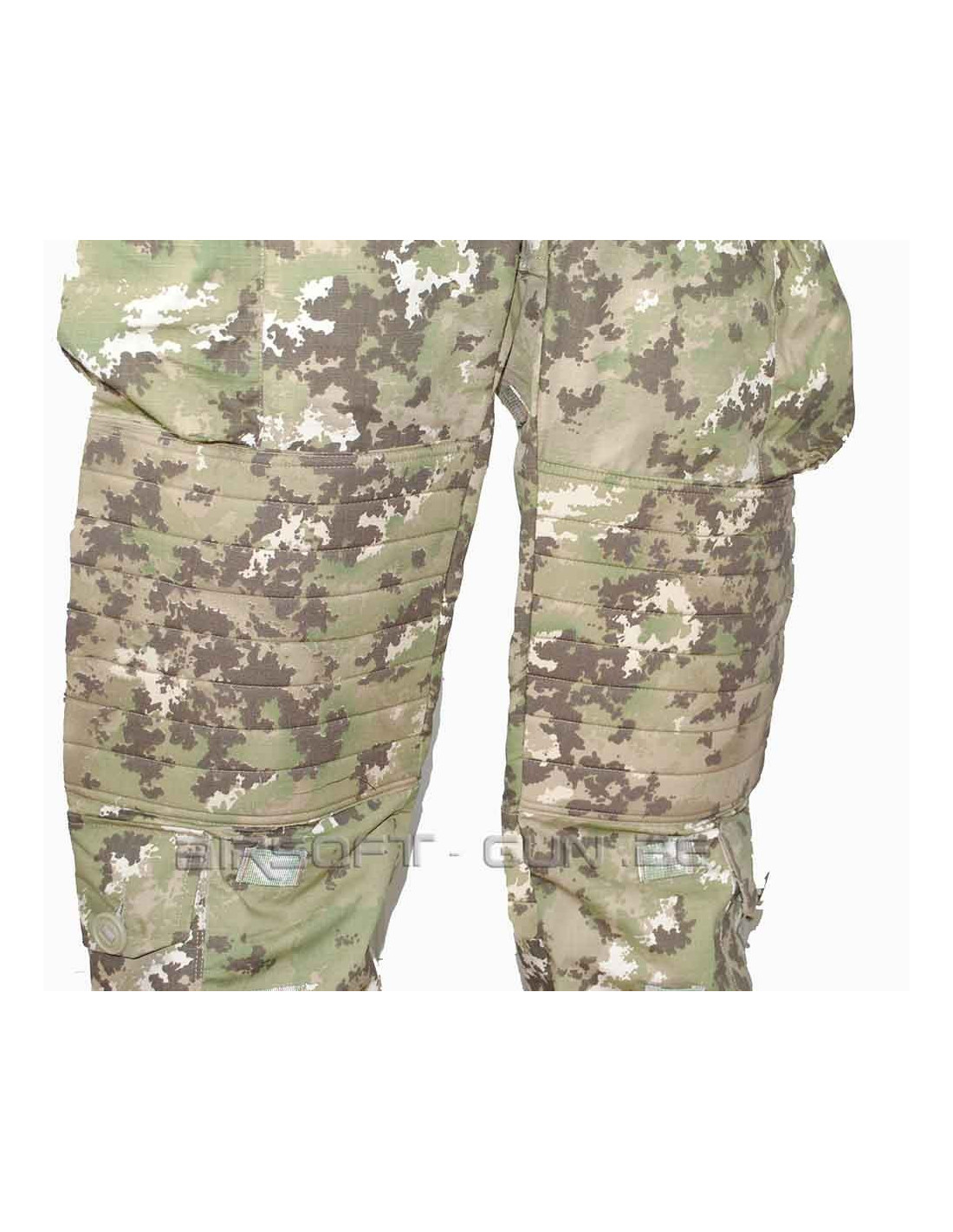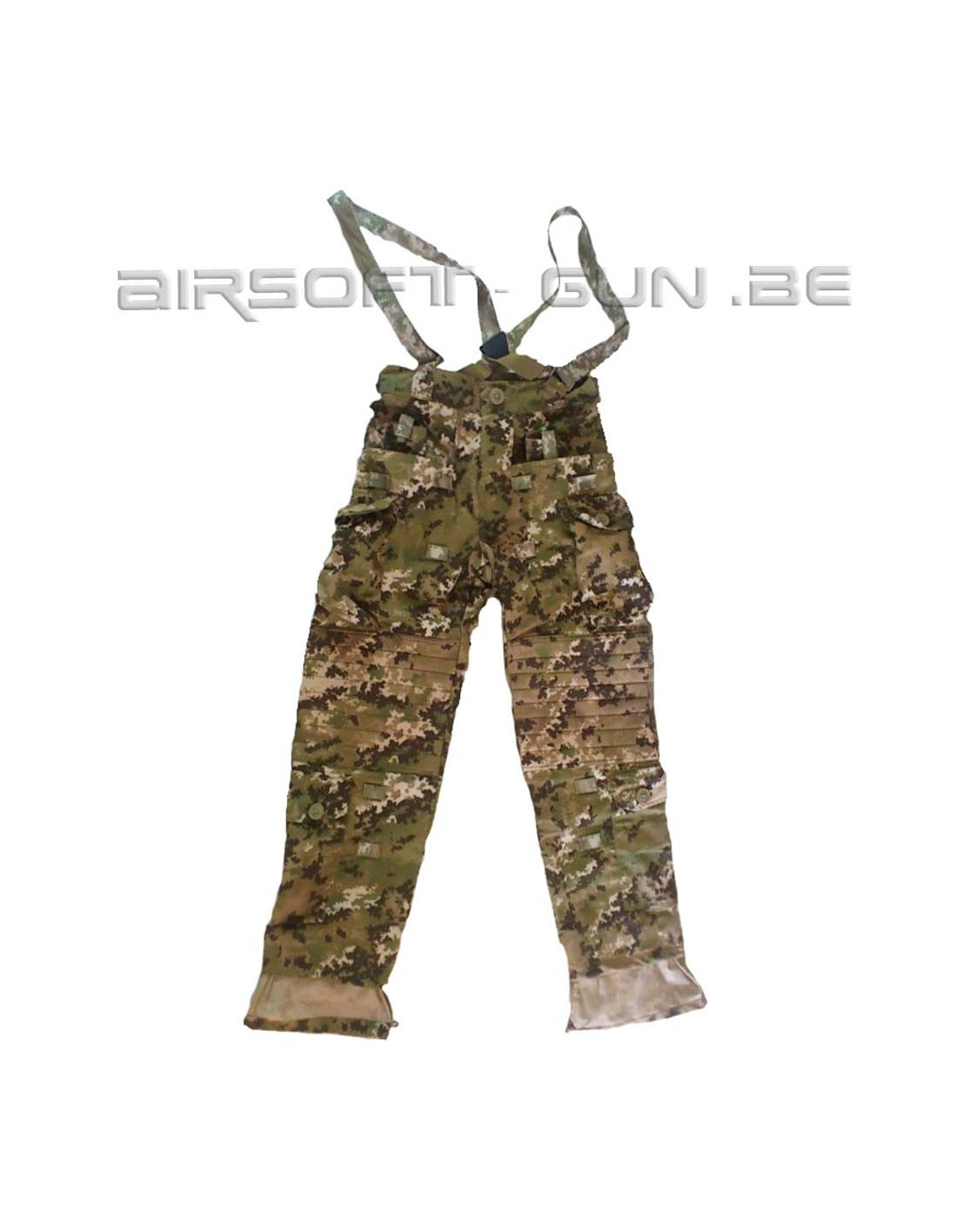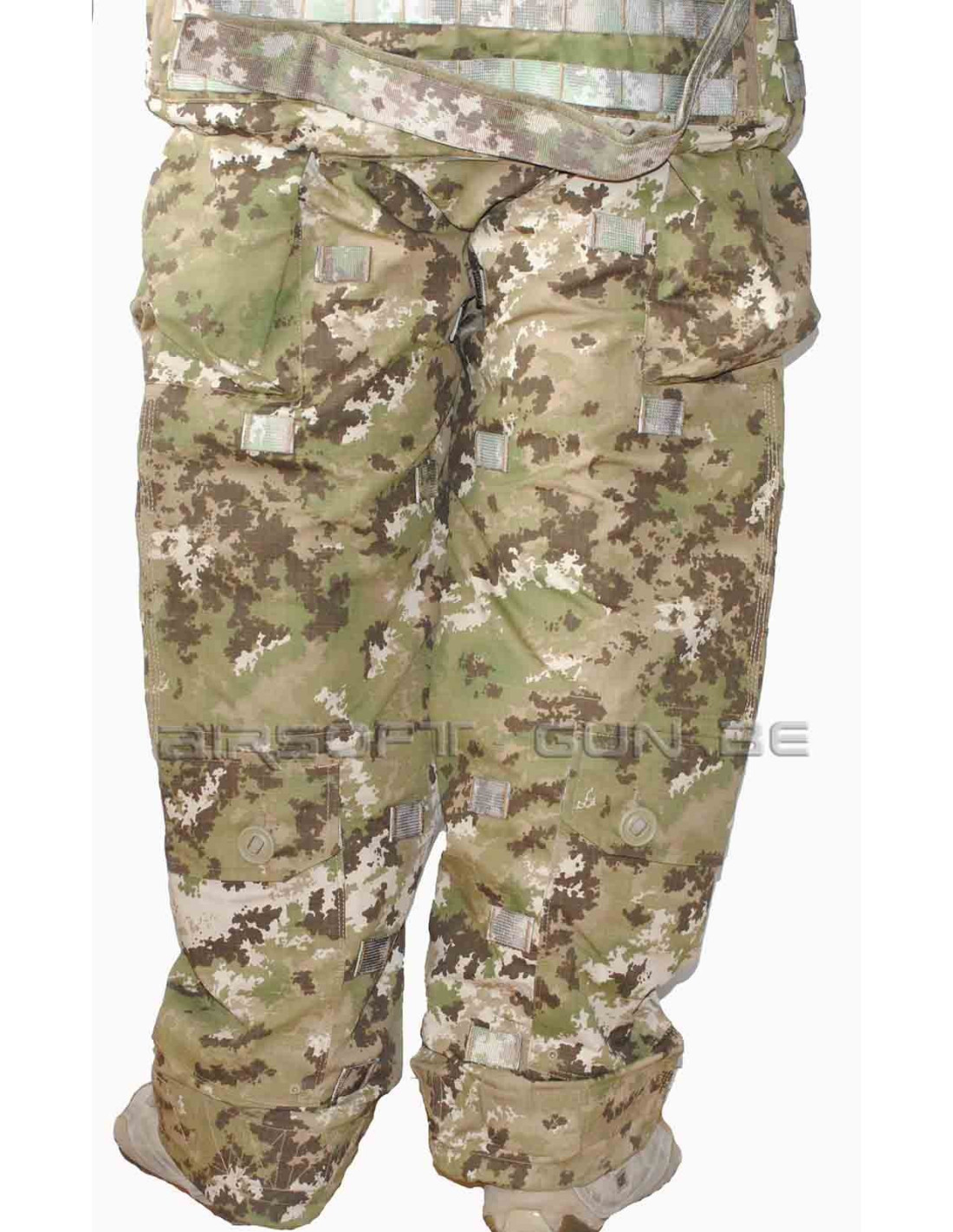 PANTALON: It has an adjustable size by elastic bands with a self-adhesive tape fastening on both sides of the pants. A pair of webbing straps, elastic and self-adhesive strips are fixed entirely on plastic passes. The size closes with a rigid Canadian-type button with a self-adhesive flap. A zip is also provided on the front of the pants. On each side of the trousers there is a large, high and deep pocket with wide openings, without closure on the front. Inside these pockets is a small narrow pouch closed by a self-addicting strip. A large bellows pocket is provided on either side of the pants outside the thigh with two rigid Canadian buttons. Inside these pockets are two very strong mesh charger doors. A rectangular low pocket is plated on the outside of the upper tibia on the legs of the pants. This pocket includes a two-button Canadian closure. A very wide back pocket without closure on both sides of the pants. Between thighs is reinforced at the intersection of the two leg seams. A protective foam on either side of the trousers sewn inside the fabric at the knees. Removable gaiters fixed by self-adhesive bands and adjustable by clamping cord. A large number of MOLLE systems cover these pants.