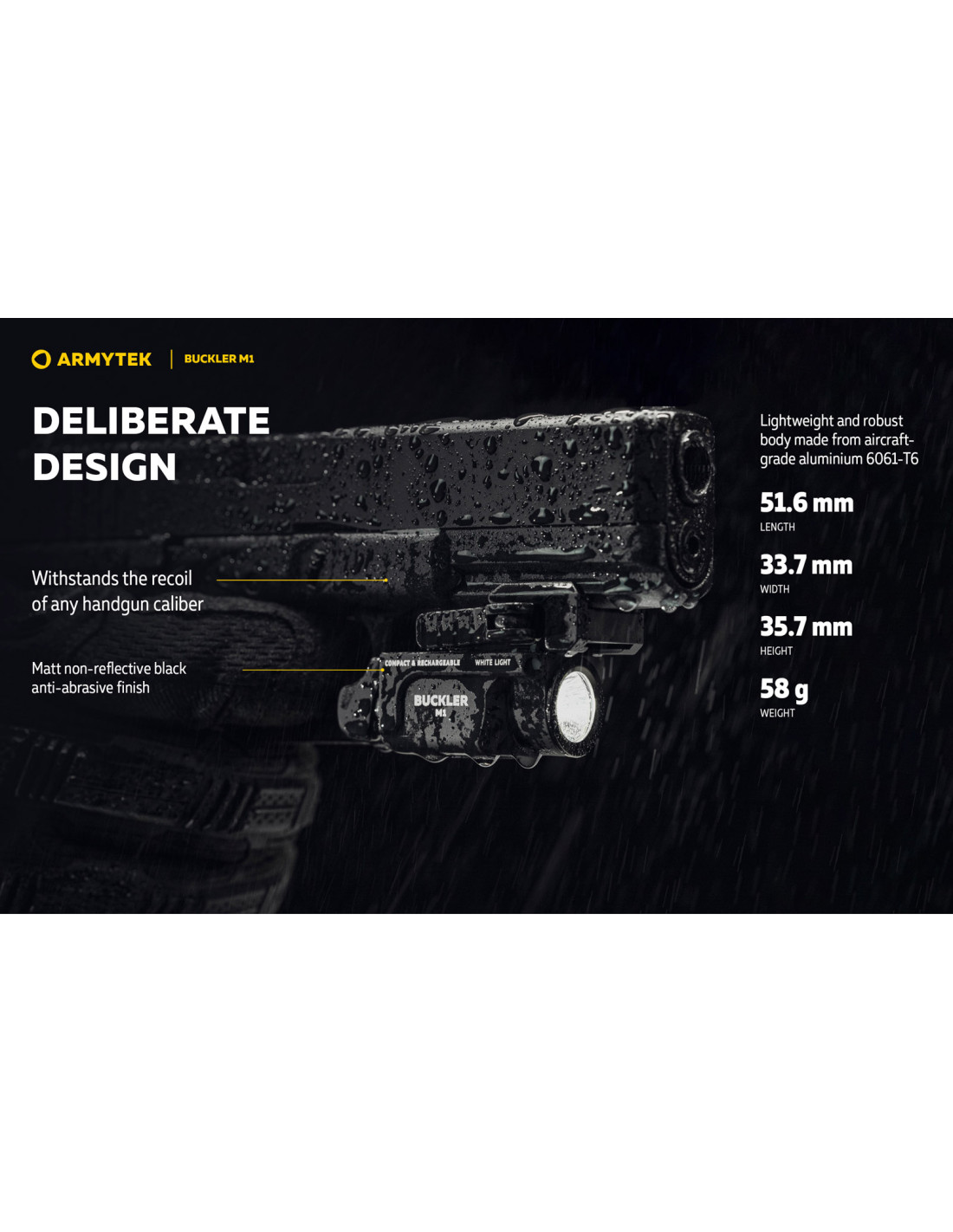La Buckler M1 est fabriquée en aluminium de qualité aéronautique avec une finition noire mate anti-abrasive. Elle supporte les reculs de tous calibres, résiste aux chutes de 2 mètres et à l’eau selon la norme IP67.