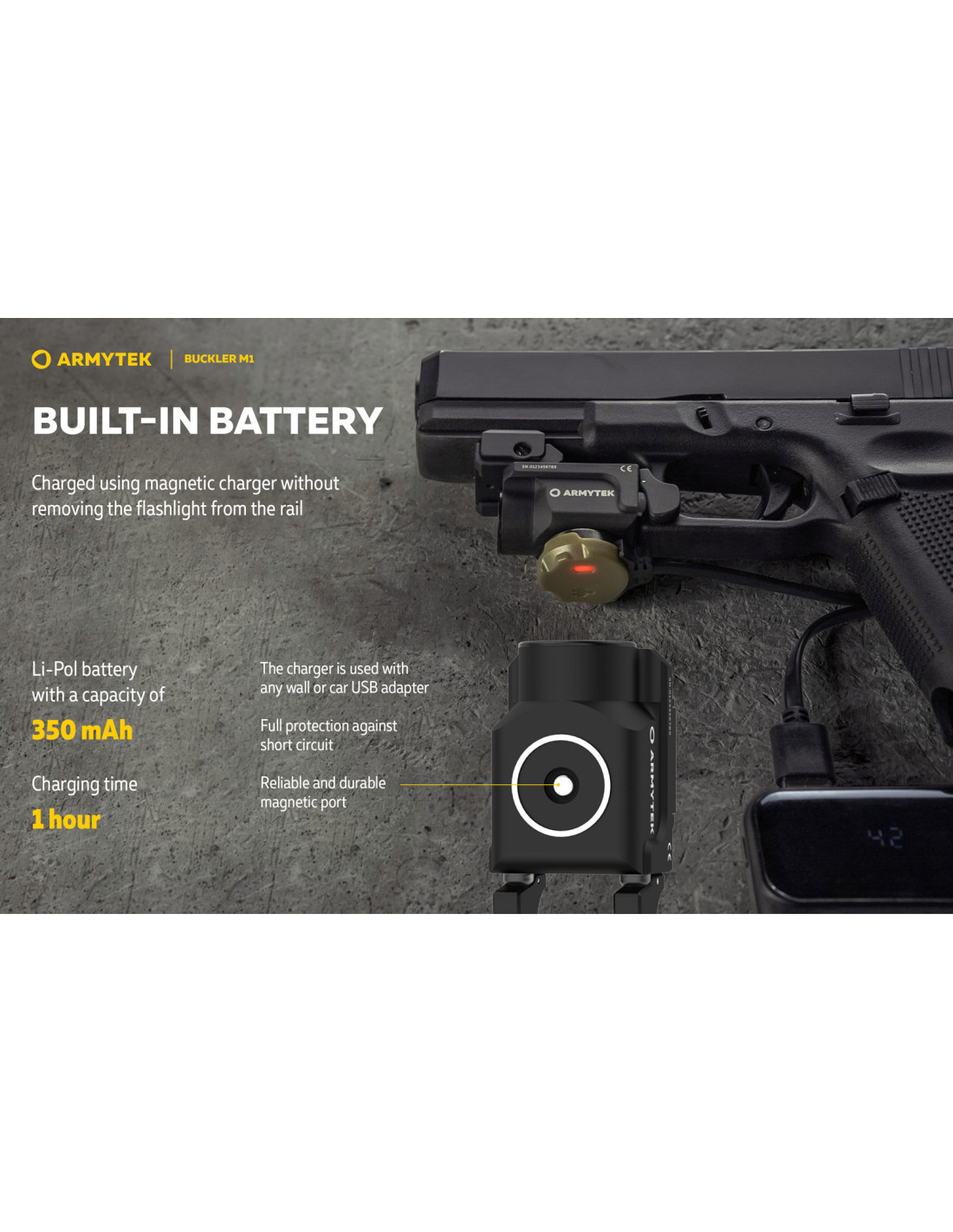 La lampe tactique Armytek Buckler M1 est conçue pour être montée directement sur une arme de poing. Elle offre une puissance lumineuse de 700 lumens avec une portée de 105 mètres, idéale pour les forces spéciales comme pour les utilisateurs civils recherchant une solution compacte, fiable et puissante. Cette lampe est équipée d’une batterie Li-Pol 350 mAh intégrée, d’un mode stroboscopique pour la défense, et se recharge par USB magnétique sans démontage.