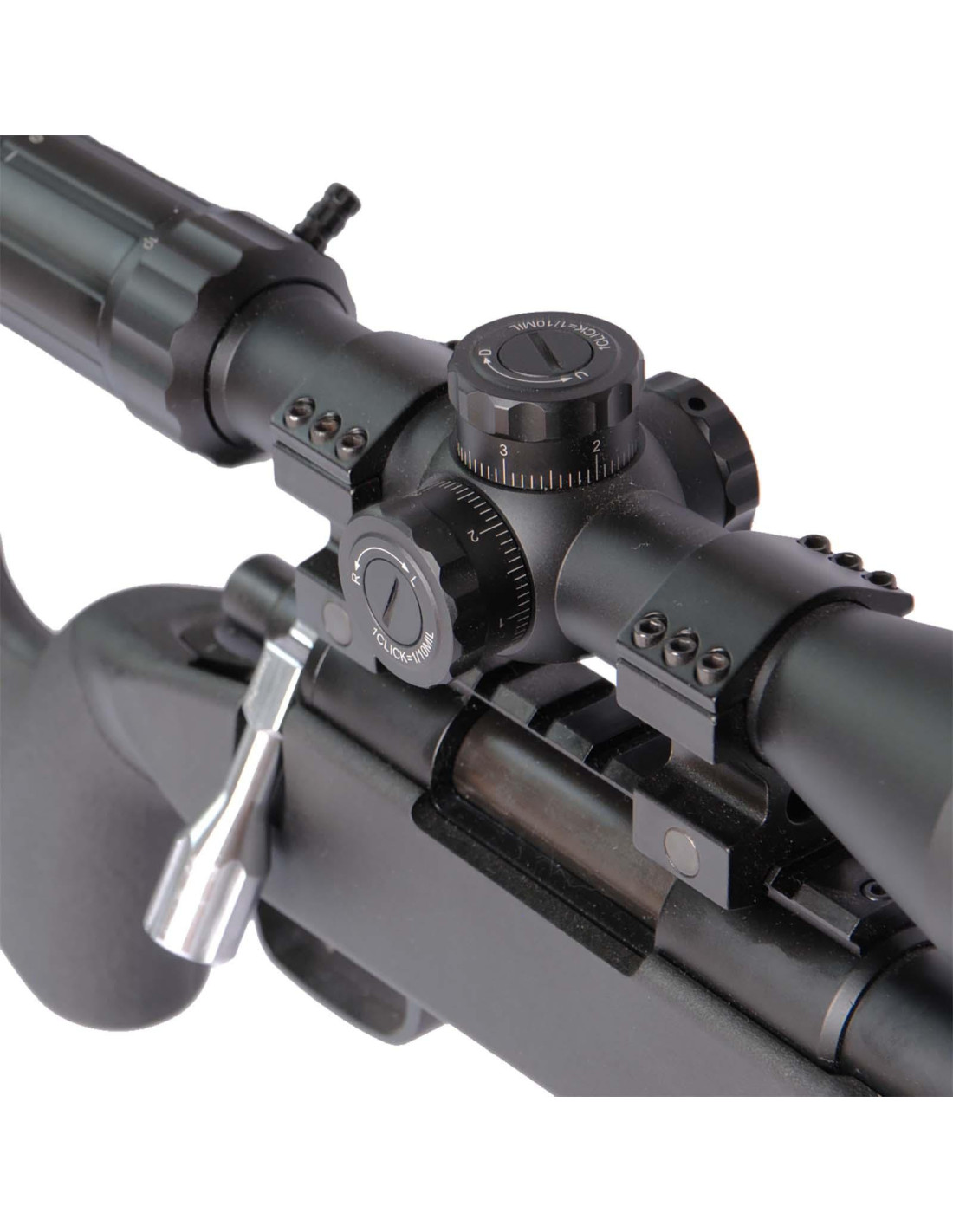 La réplique est équipée d'un Corps Maple Leaf MLCS1 en couleur Noir, il est agrémenté d'une lunette de visée Vetor Optics Marksman 3.5-10X44 SFP de couleur Noire.