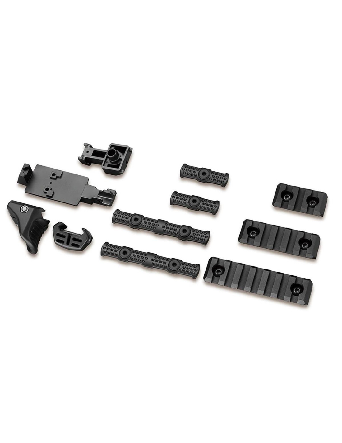 La réplique est livrée avec deux types de protection M-LOK, deux types de butées de main en fixation picatinny et un support spécial qui peut être utilisé pour fixer le Micro Pro Site en option à une position inférieure.