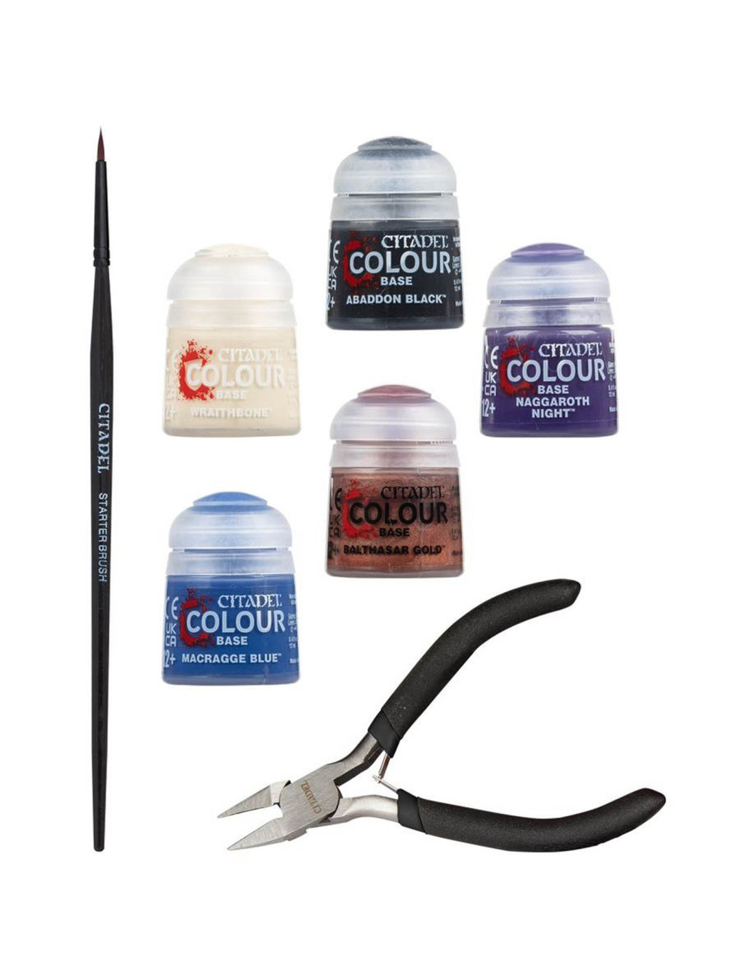 - 🎨 5 pots de peinture 12 ml : Abaddon Black, Wraithbone, Balthasar Gold, Naggaroth Night, Macragge Blue